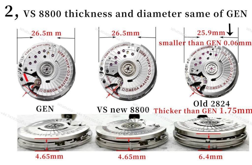The genuine Omega 8800 movement has a diameter of 26.5 mm and a thickness of 4.65 mm.