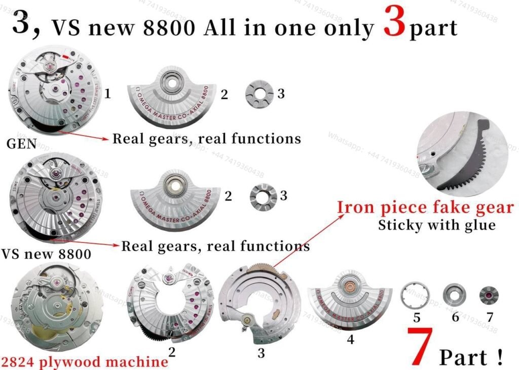 Traditional 2824-based “decorated” movements attempt to mimic the appearance by gluing on a fake iron gear plate and require seven parts to assemble, lacking real functional integration.